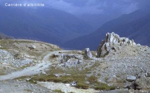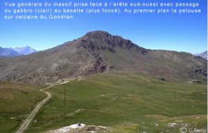 En suivant le sentier le long de l’arrête sud-ouest, nous traversons un éboulis de gabbros, roches formées de gros cristaux blancs de feldspath et bruns de pyroxène. La présence de ces gros cristaux témoigne du refroidissement lent, en profondeur. Ces gabbros sont très variés et sont parfois recoupés par des filons de diabase ou d’albitite. Un beau filon d’albitite est visible sur le versant sud du col du Gondran. Il a été exploité pour empierrer les routes militaires de ce secteur.