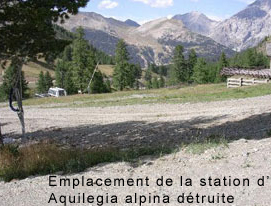 Depuis plusieurs années nous avons noté la présence d’une station d’Ancolie alpine (Aquilegia alpina), espèce protégée au niveau national (annexe 1), dans une pelouse du Gondran non loin du restaurant d’altitude. Cette station avait d’ailleurs été montrée à des responsables de la station. Alors qu’en juillet 2002, nous pointions 58 pieds d’Ancolie alpine, quelle ne fut pas notre surprise de constater en juillet 2003 que la majorité de la station avait été détruite par un nivellement de piste de skis et de travaux pour l’installation de canons à neige. Alors que, lors des jeux olympiques d’Albertville, un virage a été créé pour éviter une station d’Aquilegia alpina, à Montgnenèvre, la piste a détruit la majorité des plants de ce secteur.